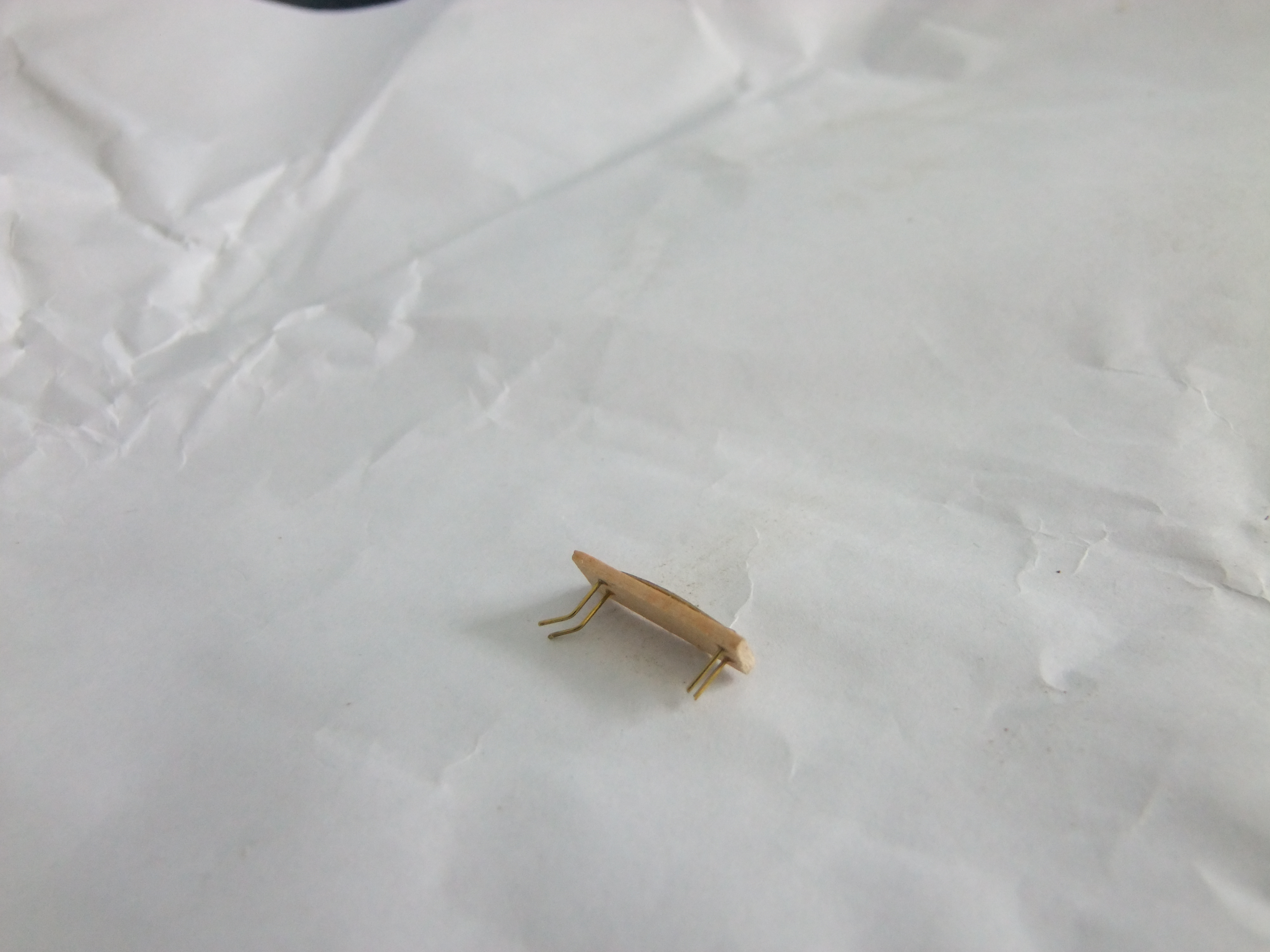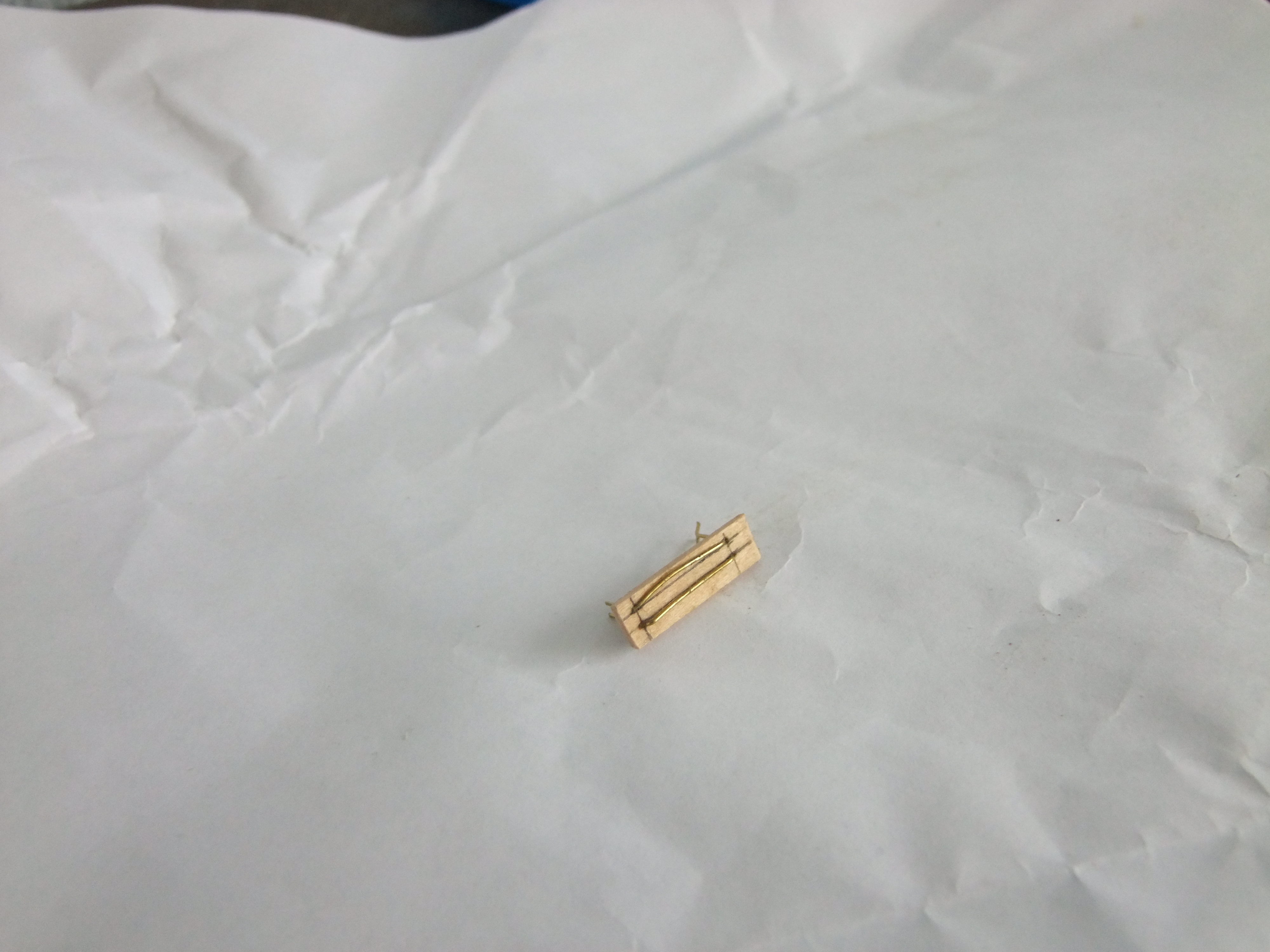 When I got round to rigging the deadeyes on Victory, I found problems using the wire jig. My solution was to make up a jig from brass wire and a piece of scrap plank. Measure across any two holes in a deadeye mark out on the piece of plank. Drill 4 0.6mm holes Bend the brass wire as per the magazine, leaving longer tails, feed the wire through the holes and secure with super glue, bend the wire as needed and trim to length. Repeat for small deadeyes.